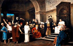 Gbr. Yesus diadili Pilatus. Tidak ditemukan kesalahan tetapi menyerahkan Yesus untuk dihukum karena diintimidasi para imam besar Bait Allah, kaum saduki dan farisi serta para elit Romawi serta raja boneka Yahudi.